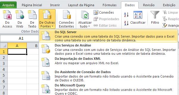 Passo 1: com oExcel aberto selecione a aba Dados->De outras fontes->Do SQL Server.