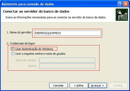 Passo 2: Com o assistente de conexão aberto, digite o nome do servidor, conforme a primeira seleção, na segunda você deve selecionar para usar autenticação windows ou usar usuário e senha, dependendo da forma como sua empresa configurou o banco de dados.