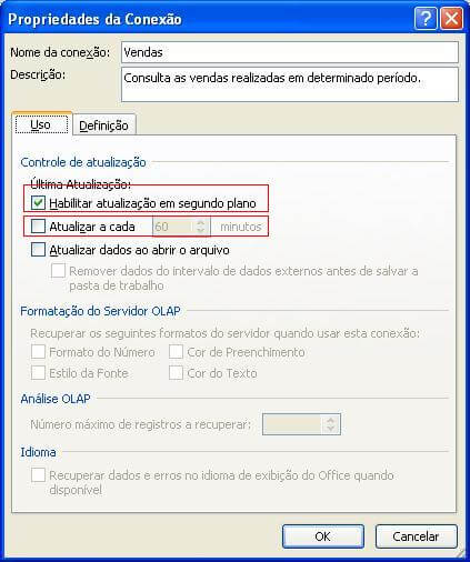 Passo 7: Aqui você deve desmarcar o botão Habilitar atualização em segundo plano, pois senão, ele irá atualizar enquanto estão sendo executados comandos no VBA, gerando problemas.