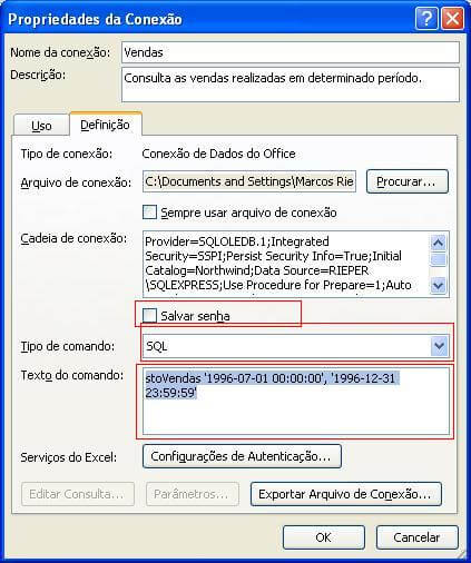 Passo 8: Aqui você deve alterar o campo Tipo de comando para SQL, e no campo Texto do comando, alterar para o nome da sto que você estiver usando, inclusive passando os parâmetros necessários. Se possuir senha marque a opção Salvar senha.