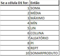 - Para cada resultado da célula a função executa uma outra função ou passa um valor fixo ou ainda o resultado de uma variável ou célula, conforme exemplo da tabela abaixo aonde a cada valor alterado é aplicada uma fórmula diferente.