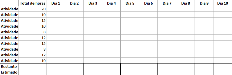 O perfeito é que o gráfico restante esteja sempre sobre o estimado ou abaixo, fazendo com que o projeto seja entregue no dia previsto.
