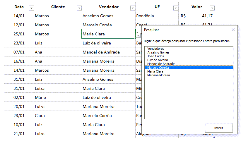 Após isso ao dar duplo clique sobre uma célula com a validação de dados temos o formulário abrindo automaticamente e ao digitar ele irá selecionar o item que está sendo digitado.