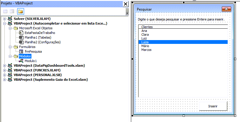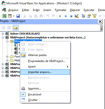 A primeira parte é a importação do projeto VBA que permite o uso de autocompletar ao digitar e selecionar o item na célula.