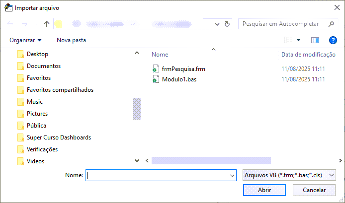 3. Selecione o arquivo frmPesquisa.frm e clique em abrir e em seguida no Modulo1.bas e clique em abrir, assim os dois serão importados para o seu projeto.