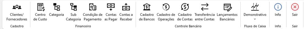 O sistema de contas a pagar e a receber em Excel possui um menu próprio que organiza e facilita o acesso às suas funcionalidades.