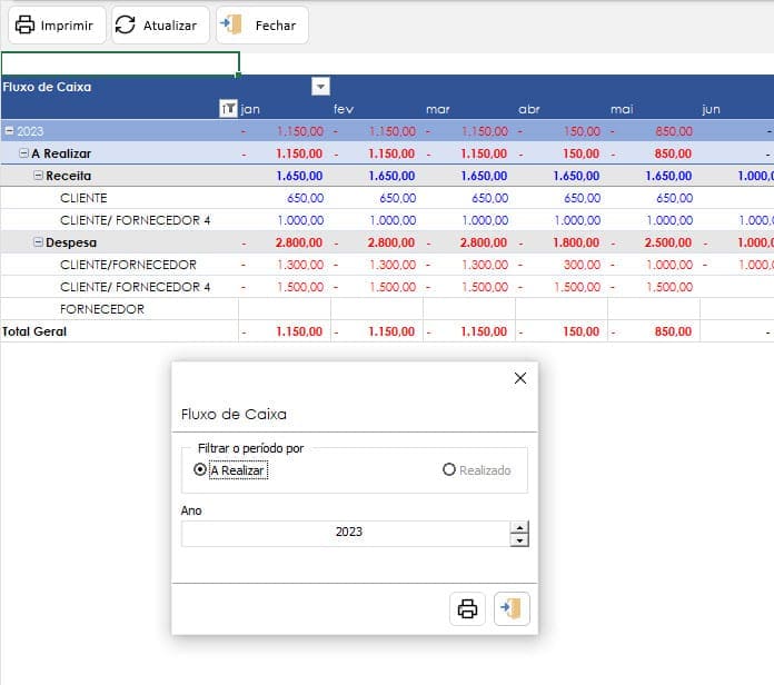 Nos resultados consolidados temos o fluxo de caixa que pode ser gerado consolidado ou por centro e custos.