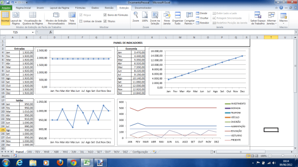 Na planilha Excel há também um painel aonde você pode identificar como estão as suas economias, entradas, saídas e como está a movimentação dos custos por centro de custo.