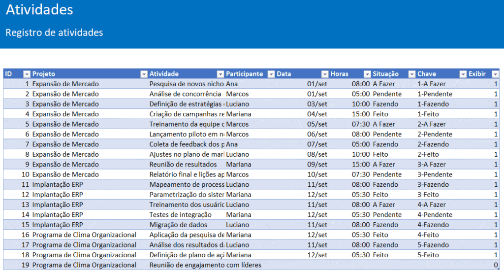 A tabela de atividades é o coração da planilha Kanban no Excel, pois é nela que ficam registradas todas as tarefas que serão exibidas no painel visual.