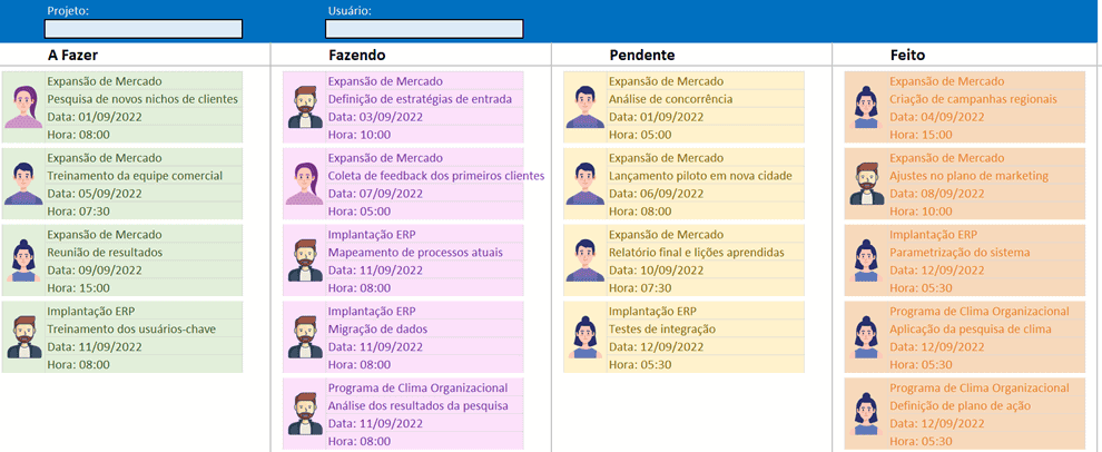 Essa estrutura permite que o Excel associe facilmente cada tarefa a um responsável, trazendo uma experiência muito mais visual e intuitiva para o Kanban.