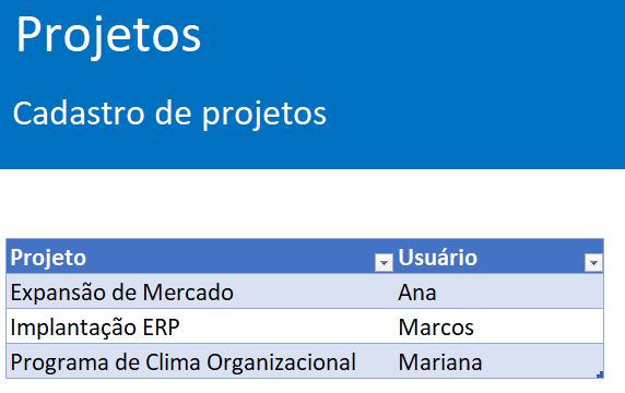 Um dos pilares da planilha de Kanban no Excel é a tabela de projetos, responsável por centralizar as informações básicas de organização e controle.
