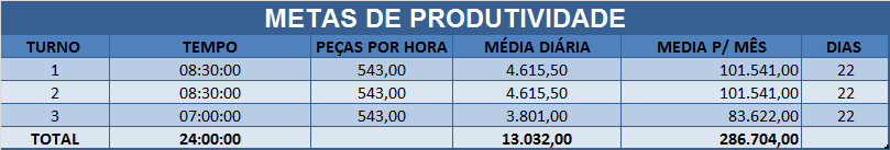 Na planilha de Metas você tem as configurações de cada turno com o tempo, quantidade de peças por hora, média de produção diária e média de peças produzidas por mês.