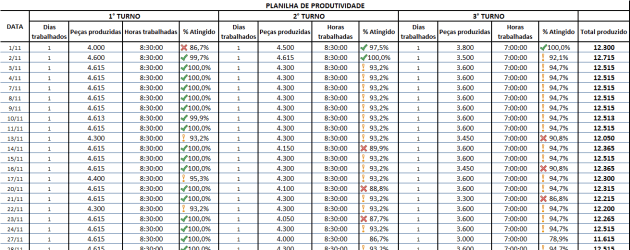 A planilha possui controles conforme a quantidade de dias trabalhados, meta de quantidade de peças produzidas por hora e por turno, aonde na mesma planilha se consegue realizar uma comparação entre os turnos e as suas metas alcançadas.