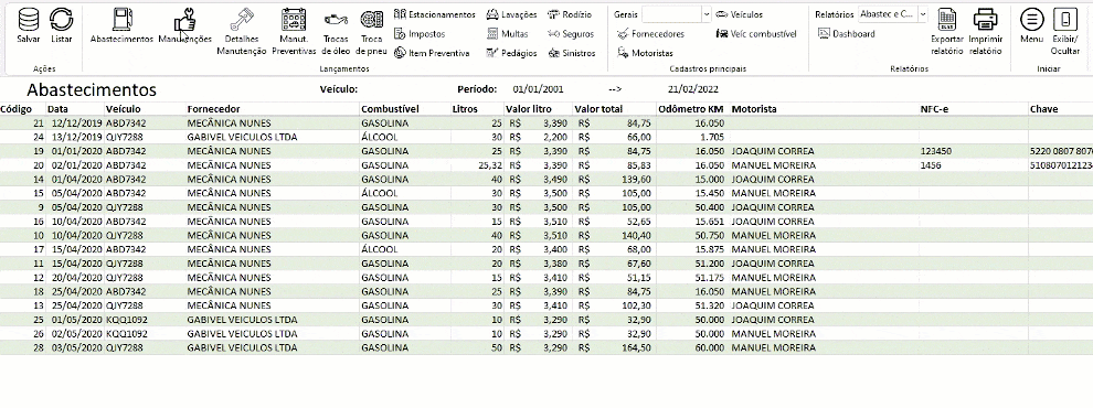 - Abastecimentos: Lançamentos dos abastecimentos com controle de documentos, fornecedores, datas, motoristas e veículos.