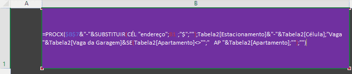 =PROCX($B$7&”-“&SUBSTITUIR(CÉL(“endereço”;B1);”$”;””);Tabela2[Estacionamento]&”-“&Tabela2[Célula];”Vaga “&Tabela2[Vaga da Garagem]&SE(Tabela2[Apartamento]<>””;” AP “&Tabela2[Apartamento];””);””)