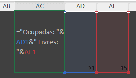 A fórmula de quantidade de vagas livres possui um cálculo semelhante, mas verificando a quantidade de vagas com menos do que 11 caracteres.