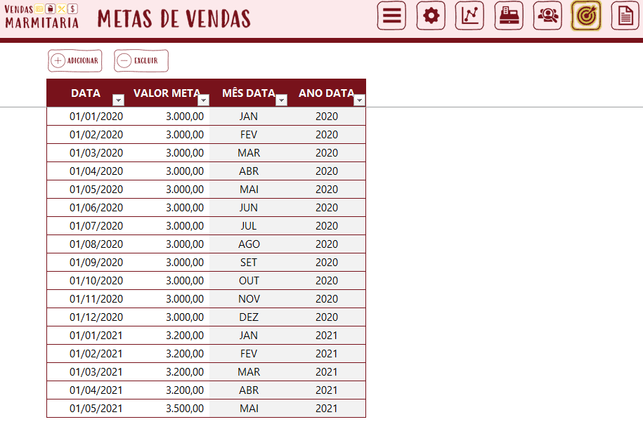 Na definição de metas você poderá colocar o valor desejado de faturamento para cada mês.