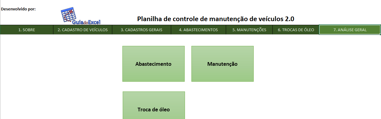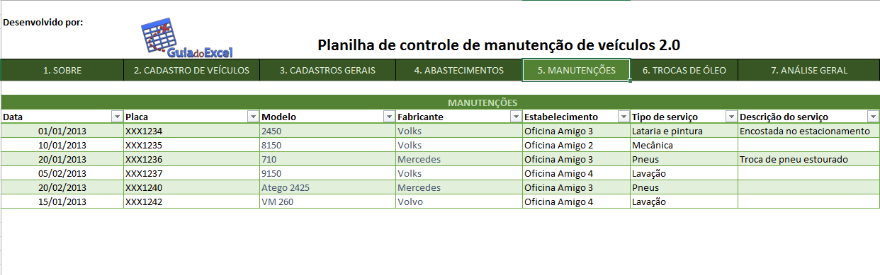 O controle de manutenção de veículos é composto pelas seguintes planilhas: