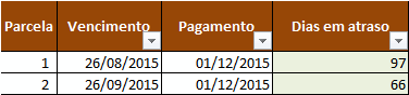 Então temos que a primeira parcela possui 97 dias de atraso e a segunda 66 dias. Estes dados serão utilizados para o cálculo dos juros.
