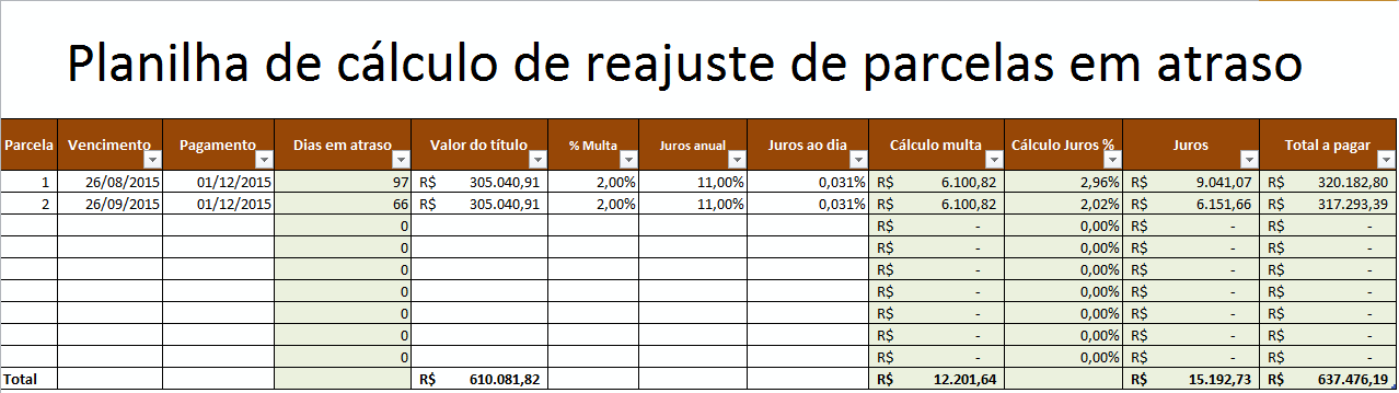 Planilha excel para reajuste de parcelas em atraso