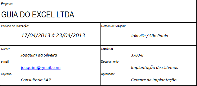 No cabeçalho do relatório há os campos que são relativos à viagem e que devem ser preenchidos pelo funcionário informando o roteiro de viagem.
