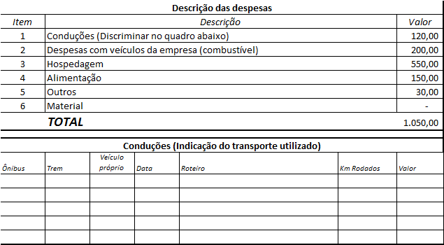 No corpo do relatório de despesas de viagem é necessário que seja discriminadas todas as despesas e o valor, e além disso os dados das conduções e o tipo de condução utilizada no relatório de viagem.