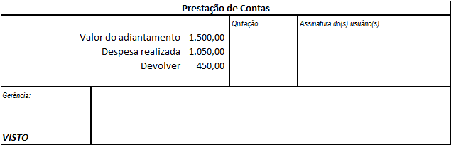 Neste local da planilha temos ainda o um local para assinatura das pessoas que participaram da viagem e também os dados de quitação e assinatura da gerência.