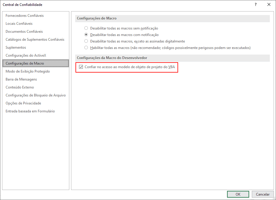 - Por fim é necessário que seja habilitado na Central de Confiabilidade para usar o suplemento VBE. Clique em Oções->Central de Confiabilidade->Configurações de Macro e marque a opção Confiar no acesso ao modelo de objeto de projeto do VBA.