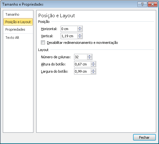 Clicando na opção Tamanho e Propriedades e na guia Posição e Layout poderão ser alteradas as propriedades das alturas dos botões, larguras e o número de colunas.