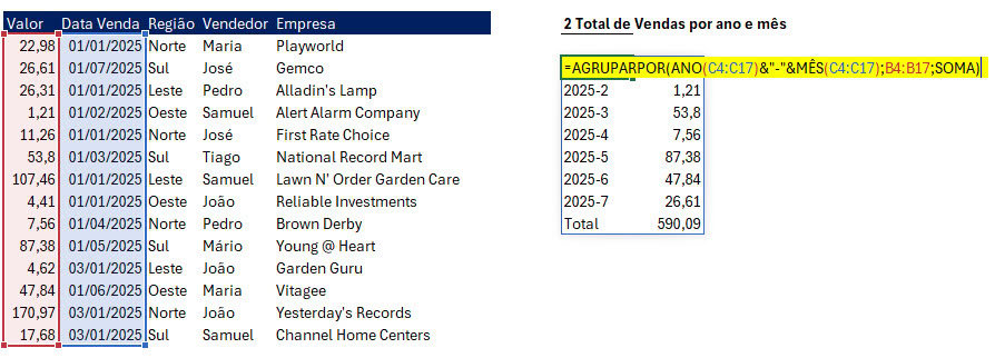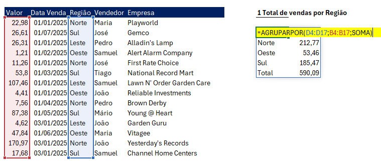 A função AGRUPARPOR é uma das mais poderosas introduzidas nas versões mais recentes do Excel (Microsoft 365), permitindo agrupar dados de uma tabela com base em um ou mais critérios, e ao mesmo tempo aplicar cálculos sobre cada grupo – como somar, contar, tirar média, entre outros.