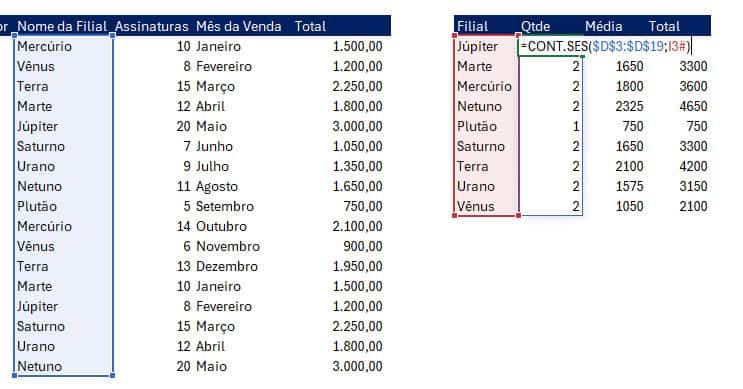 No exemplo da nossa tabela estamos realizando uma contagem quando o nome da filial é a determinada em uma coluna.