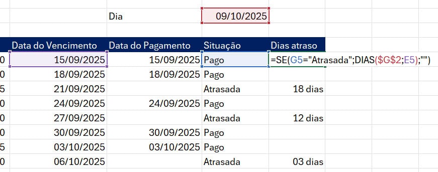 Outro exemplo é verificar se está em atraso e contar a quantidade de dias em atraso usando a função DIAS.