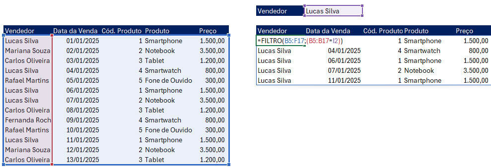 A função FILTRO do Excel é uma poderosa ferramenta dinâmica que permite extrair dados de uma tabela com base em critérios definidos, retornando apenas os valores que atendem às condições especificadas. Ela é especialmente útil para criar relatórios interativos, análises filtradas e dashboards automatizados, eliminando a necessidade de usar filtros manuais ou fórmulas auxiliares. Com FILTRO, você pode gerar automaticamente uma nova lista de dados, atualizada em tempo real conforme os critérios são alterados.