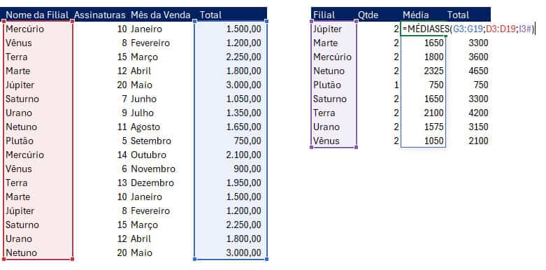 Para retornar uma média condicional usamos a função MÉDIASES realiza a média condicional conforme definido em uma coluna de valor condicionado à uma coluna de nome da filial.