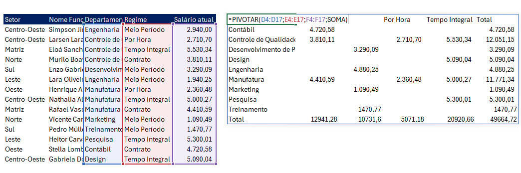 A função PIVOTAR é uma função de matriz dinâmica disponível no Excel 365 que permite criar resumos semelhantes a Tabelas Dinâmicas diretamente com fórmulas, de forma mais flexível e programável. Ela reorganiza e resume grandes volumes de dados, permitindo agrupar informações por linhas e colunas e aplicar funções de agregação como SOMA, MÉDIA, CONTAR, entre outras.