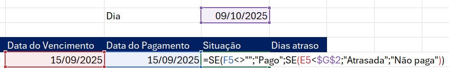 A função aplicada é =SE(F5<>””;”Pago”;SE(E5<$G$2;”Atrasada”;”Não paga”))