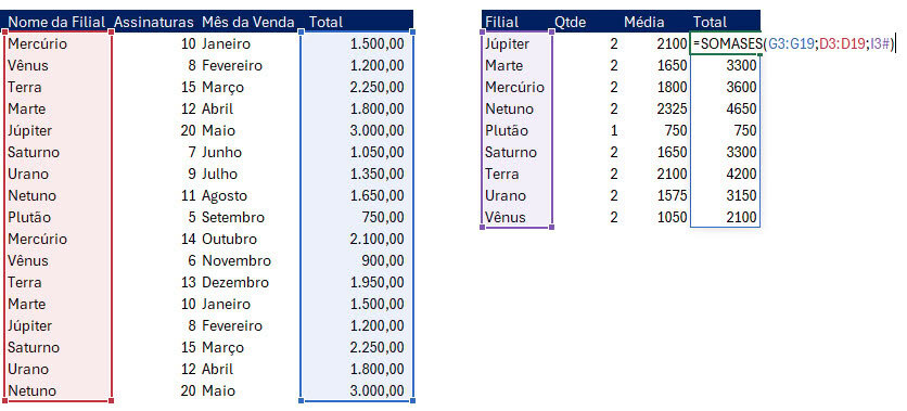 Por fim, para realizarmos somas condicionais usamos a função SOMASES. No exemplo estamos realizando a soma condicional do total de venda pelo nome da filial.